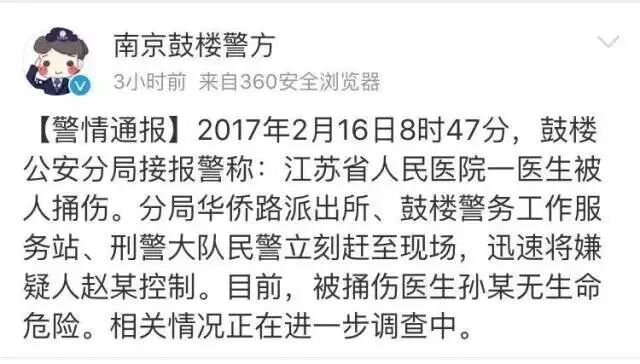 根据南京市公安局鼓楼分局官方微博消息,2月16日上午,江苏省人民医院一名主任医生在自己的办公室内被一名男子刺伤。目前,行凶者赵某目前已经被警方刑事拘留,孙医生经抢救已脱离生命危险。这起伤医事件究竟是什么原因?
