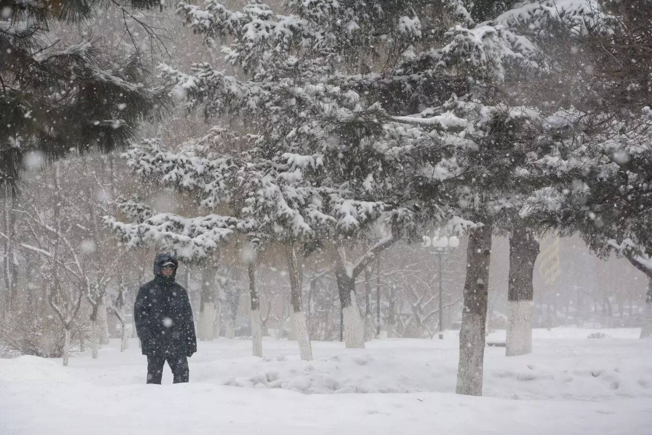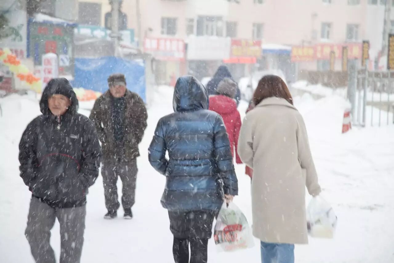 △2月19日,新疆阿勒泰市民冒雪出行。图/视觉中国