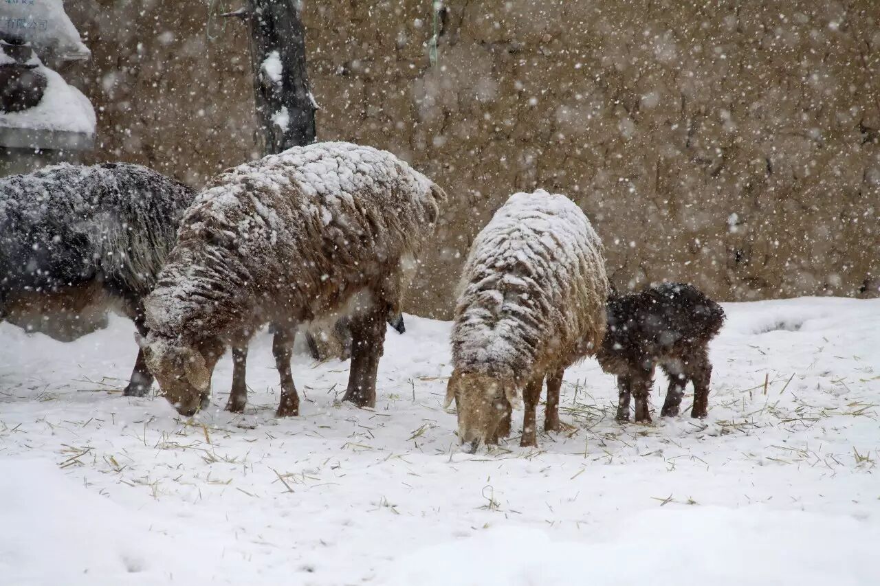 △2月19日,新疆阿勒泰生产母羊和小羊羔在雪地里觅食。图/视觉中国