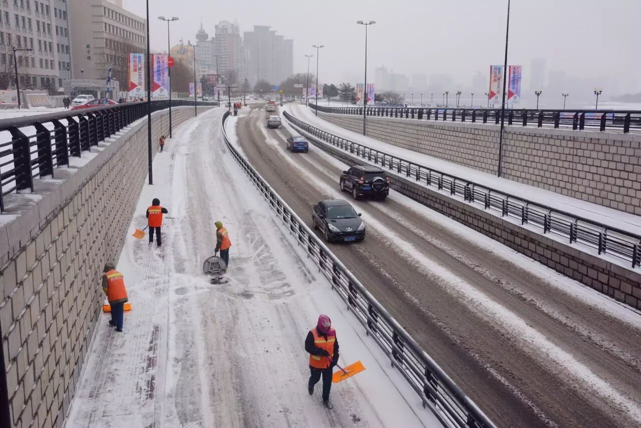 △2月19日,在吉林省吉林市街头,环卫工冒雪清理地面积雪。图/视觉中国