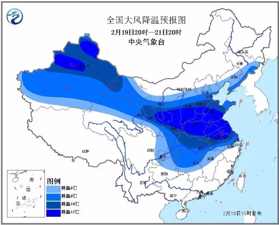 上述地区将伴有4~6级大风,东部海域将有6~8级偏北风。南疆盆地、甘肃西部、内蒙古西部伴有沙尘天气。中央气象台2月19日18时发布寒潮蓝色预警。