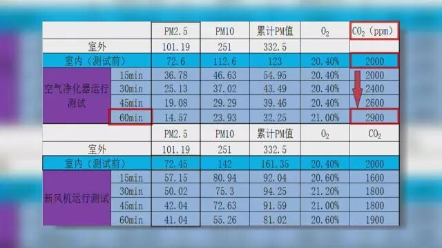 在这项实验中,记者先后打开空气净化器和新风系统。实验时间为1小时,每隔15分钟记录一次,观察室内PM2.5和二氧化碳浓度变化。空气净化器测试完成后,将打开房门,让室内空气还原到初始状态,再开启新风系统,进行第二轮测试。
