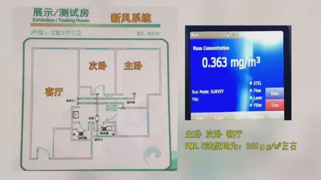 经过仪器检测,1个小时后,包括客厅和卧室在内的所有房间,PM2.5浓度均为360μg/m³,依旧是重度污染。不仅客厅不如空气净化器,就连两个卧室的污染指标,也都比空气净化器严重。