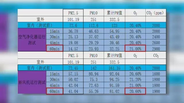 氧气含量方面,新风系统开启一个小时后,室内空气的氧气含量与空气净化器开启的一个小时候的氧气含量基本相同。