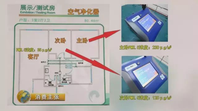 但通过仪器检测,两间卧室的PM2.5浓度依然很高,主卧230μg/m³,次卧120μg/m³,仍处于严重污染状况。也就是说,这台净化面积为50平方米的空气净化器,它能很好地解决客厅的空气净化问题,但是超出它净化面积的卧室,依然空气污染严重。