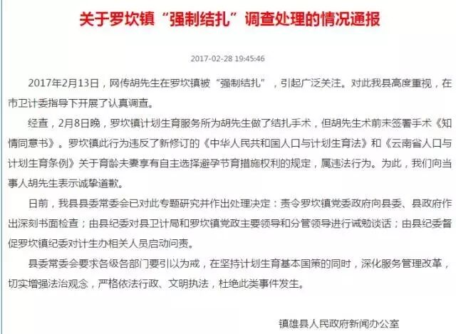 镇雄县政府新闻办对外发布通报称,通过调查,认为胡先生被结扎时没有签署《知情同意书》,并非自愿。另相关政府工作人员违反新修订的《计生法》和《云南省人口与计划生育条例》中的相关规定,属于违法行为。