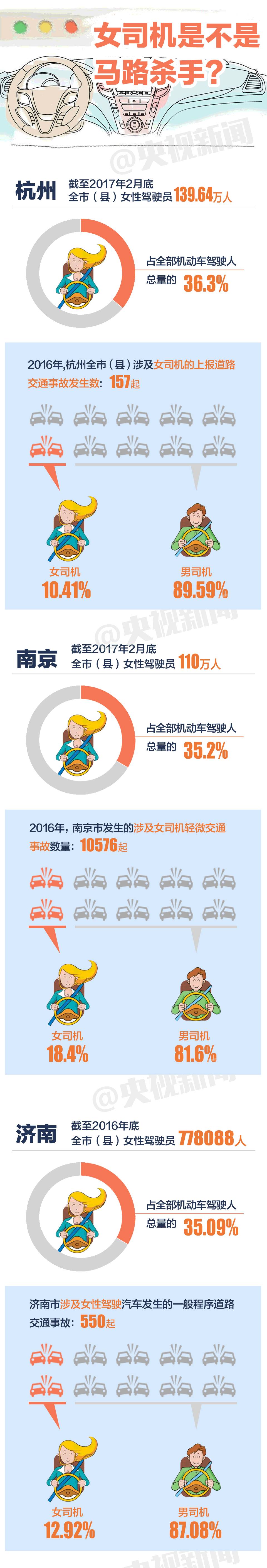 3月8日妇女节这天,杭州、南京、济南三地的交警蜀黍都通过媒体发布了一组有关女司机的大数据。那女司机是不是马路杀手呢?来看看数据怎么说吧!