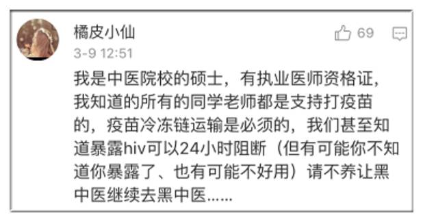 然而,拒绝疫苗并不是中医的理论。有学中医的网友在评论中辟谣,称专业的中医都是支持接种疫苗的。