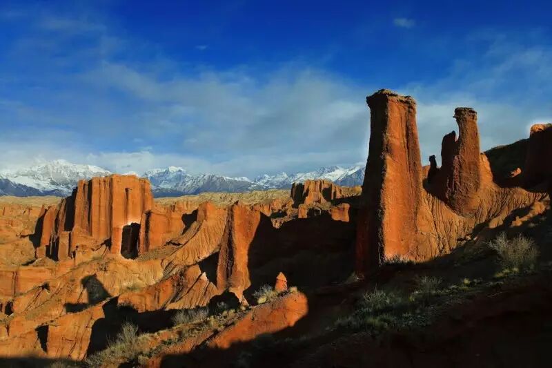 天山托木尔大峡谷,又称“库都鲁克大峡谷”,维吾尔语意为“惊险、神秘”,是通往南北天山古代驿路木扎特古道的必经之地。天山托木尔大峡谷是天山南北规模最大、美学价值最高的红层峡谷,被誉为“峡谷之王”。峡谷内沟壑纵横、迂回曲折,到处是红崖赤壁和千姿百态的石峰石柱。