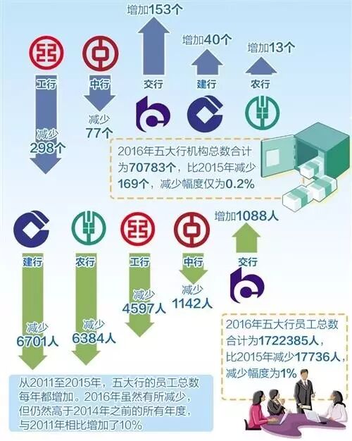 从工作人员来看,根据银行各年发布的年报,2016年五大行员工总数合计为1722385人,比2015年的1740121人减少17736人,减少幅度为1%。其中,建设银行、农业银行、工商银行、中国银行分别比上年减少6701人、6384人、4597人、1142人,交通银行比上年增加1088人。