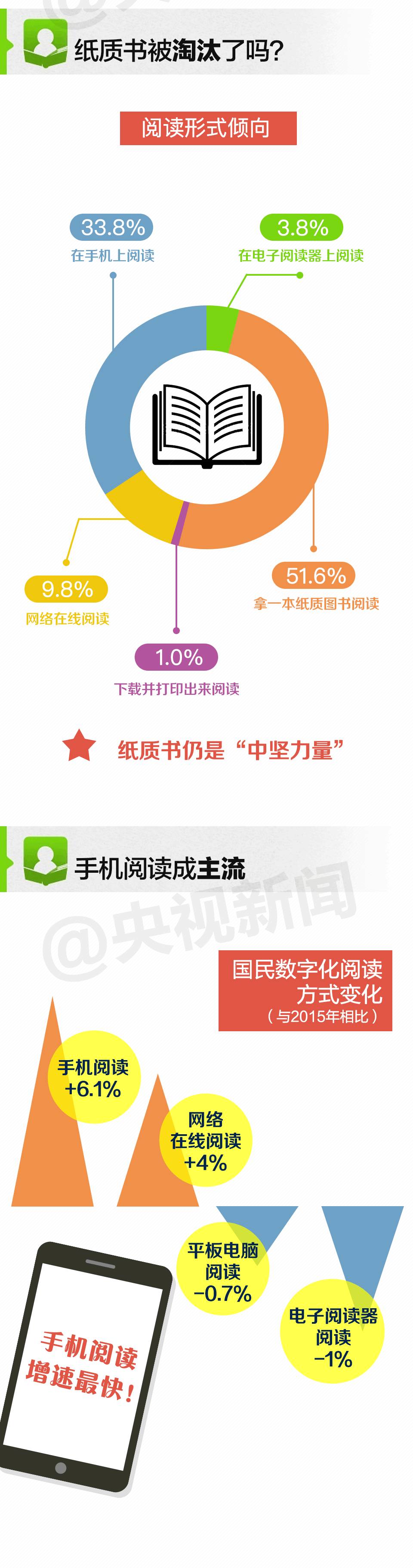 除了总体阅读量上的增长,这次调查还有一些数据值得一看。2016年全年,中国人的阅读情况出现了怎样的变化?往下刷,一图解读给你答案↓↓