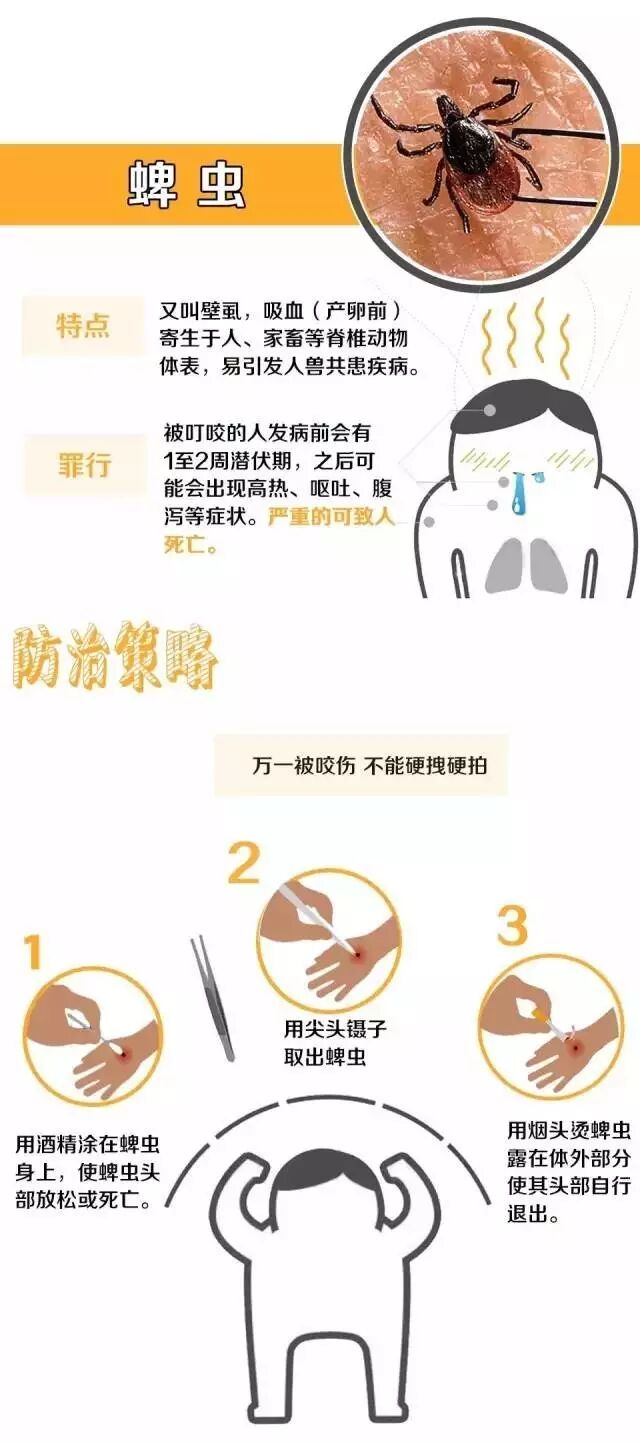 近几年,被蜱虫叮咬的病例屡见报端。医生介绍,蜱虫是一种寄生虫,携带多种病毒,主要活动在户外,因为叮咬皮肤时没有疼痛的感觉,所以被叮咬者往往觉察不到。但它的危险却不小!出门游玩时,一定要要当心蜱虫叮咬,不要直接坐在草地上,回家后应更换衣物,认真清洗。