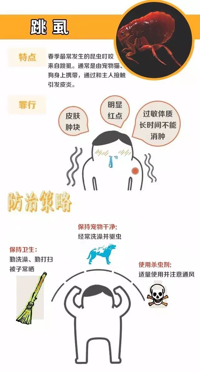 医生表示,跳蚤通常是由宠物猫、狗身上携带通过和主人接触才引起的,除了保持生活环境的干净,还需保持宠物干净,经常洗澡并驱虫。