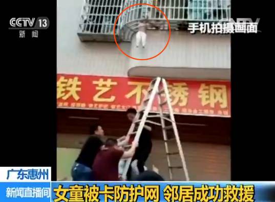 19日,广东惠州的一个两岁半女童爬上自家二楼窗台,结果上半身被卡在阳台的防护网里,身体悬空。情况危急,孩子的母亲紧紧抓住孩子小手。