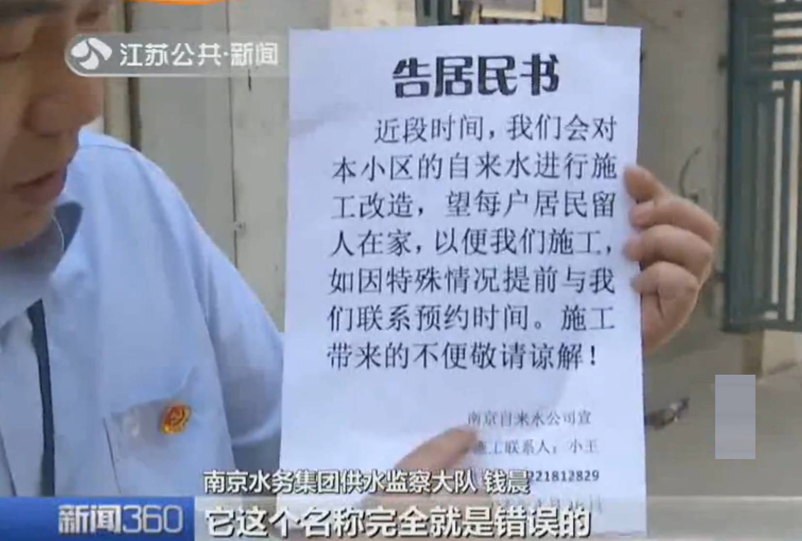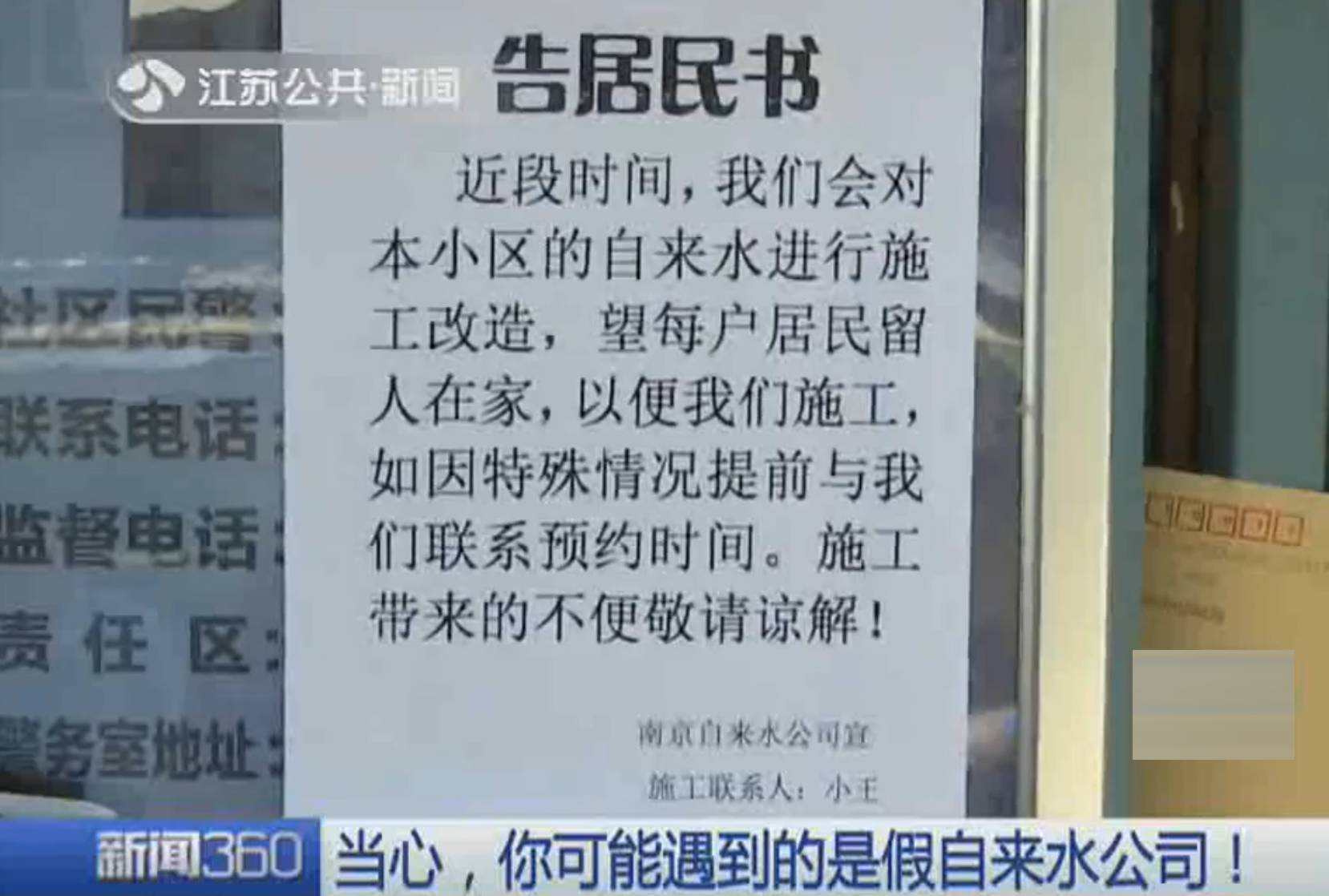 江苏南京建邺区玉塘村小区是个老小区,直到现在,居民家中的水表尚未出户(即水表安装在房屋的外面,这样抄表时就不需要进家里),管线也存在老化现象。一周前,有自来水公司贴出通知,表示将上门为居民进行管线改造,这让居民们十分开心。可是这两天,居民们却意外发现,他们遇到的竟然是一家假的自来水公司。
