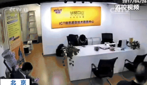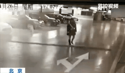 监控显示,4月26日,北京朝阳区一商场地下停车场内,一辆白色越野车撞破墙壁,冲入墙壁另一侧的一家公司,正在办公的三名工作人员被气浪和碎片掀向一边,其中一人爬起后慌忙躲避。