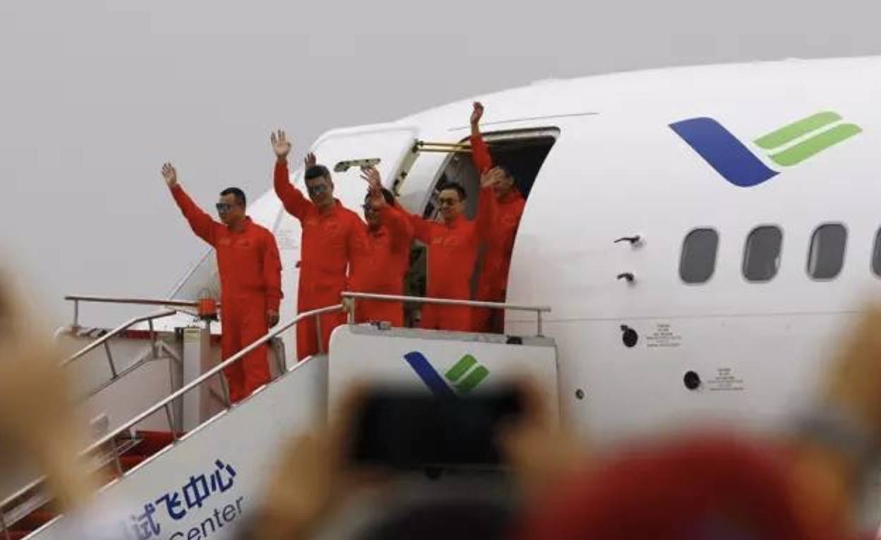 △5日,C919客机完成首飞,在上海浦东国际机场着陆后,首飞机组人员走出机舱向观礼嘉宾挥手致意。