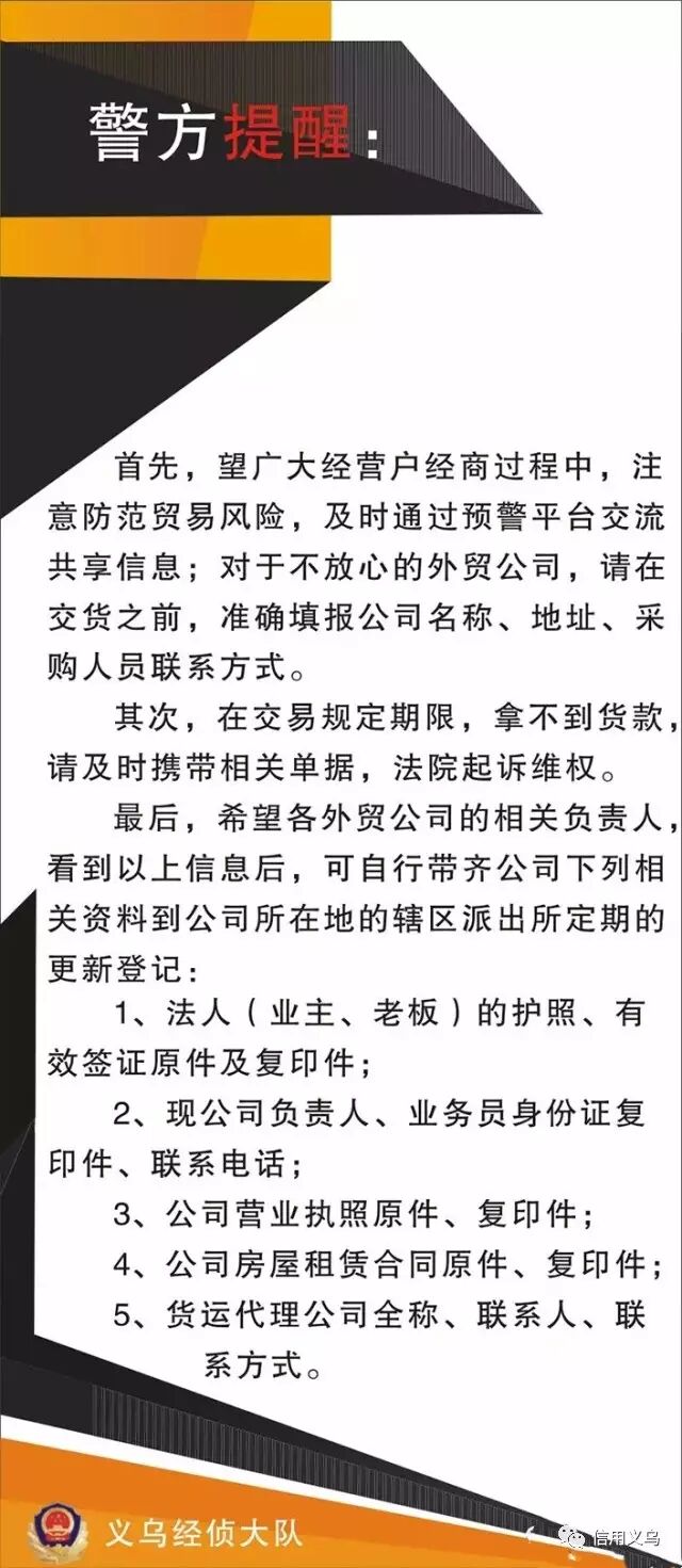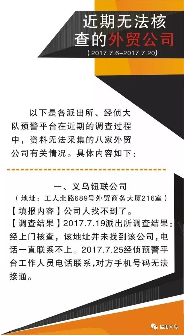 自古以来,做生意都是以诚信为本,才能发展壮大,良好的口碑是一个公司生存和发展的基石。但是,在义乌经商的小伙伴注意了,近期,义乌经侦大队通报了无法核查的外贸公司名单,具体内容如下: