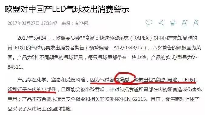新华网的稿件中称,欧盟之所以发出如此警示,因为“产品存在化学、窒息和受伤风险,因为气球容易爆裂,释放出包括纽扣电池、LED灯、锋利钉子在内的小部件,且可能会被小孩吞咽,并对包括食道和胃部在内的器官造成伤害或窒息;产品不符合要求玩具安全指令和相关的欧洲标准EN 62115。”