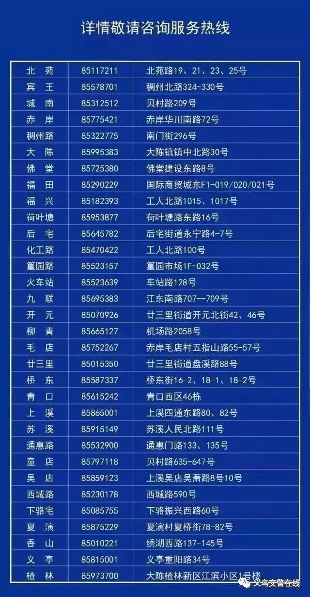 除上述受理点外,记者了解到,本地人还可以选择“金华公安”“义乌公安”“义乌交警在线”等微信公众号,进行网上处理交通违法行为,同时,全市32个“警医邮”服务点及各辖区交警大队均可以代办相关的交管业务。