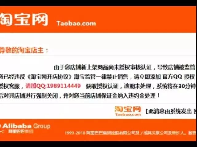 看到这条警告后,小陈心想“自己的产品确实没有注册品牌,是不是真的不能卖?好不容易注册好的淘宝店,不能说关就关呀!”于是小陈赶紧添加提示中的QQ号码,对方QQ名字是“淘宝网店铺授权中心”,小陈就信以为真,跟这名“客服”聊了起来。