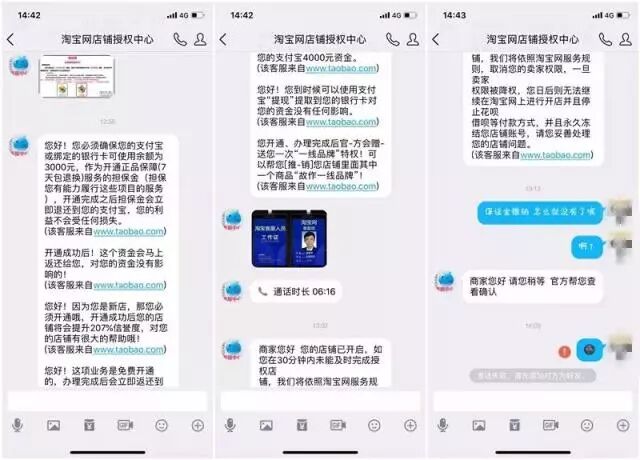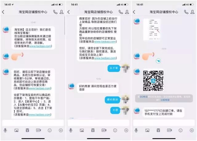 4月26日,小陈看着网上的教程折腾了一个上午,终于注册好了自己的淘宝店,还交了1000元押金,万事俱备,接下来就要在淘宝店上新产品了。可是新店才注册好1小时,就有一个自称是“网安审查13844”的人通过“阿里旺旺”来添加小陈为好友。通过好友以后,马上就发来一条“警告”,告知她刚才上架的产品未“授权审核认证”,需要添加一个“官方授权客服QQ”进行“授权审核认证”,否则就要关闭她的淘宝店,并且把之前交的押金当做“违约金”处理。