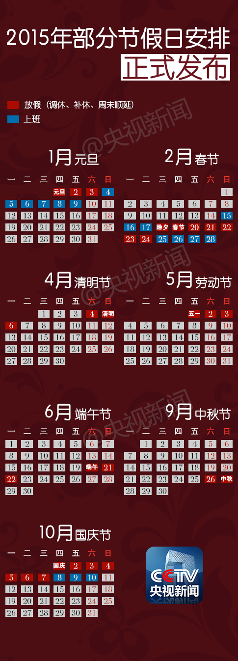 看完上面的安排,您有没有发现2015年的清明节,端午节,中秋节,国庆都是在周末,而且中秋那天的补休呢!别和我说话,热线君先去吃包辣条压压惊!