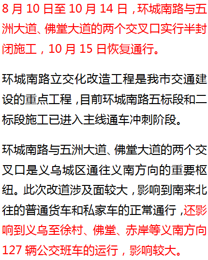 相互转告:义乌城区往佛堂方向两条主要道路明天起均半封闭施工两个月(附绕行方案)