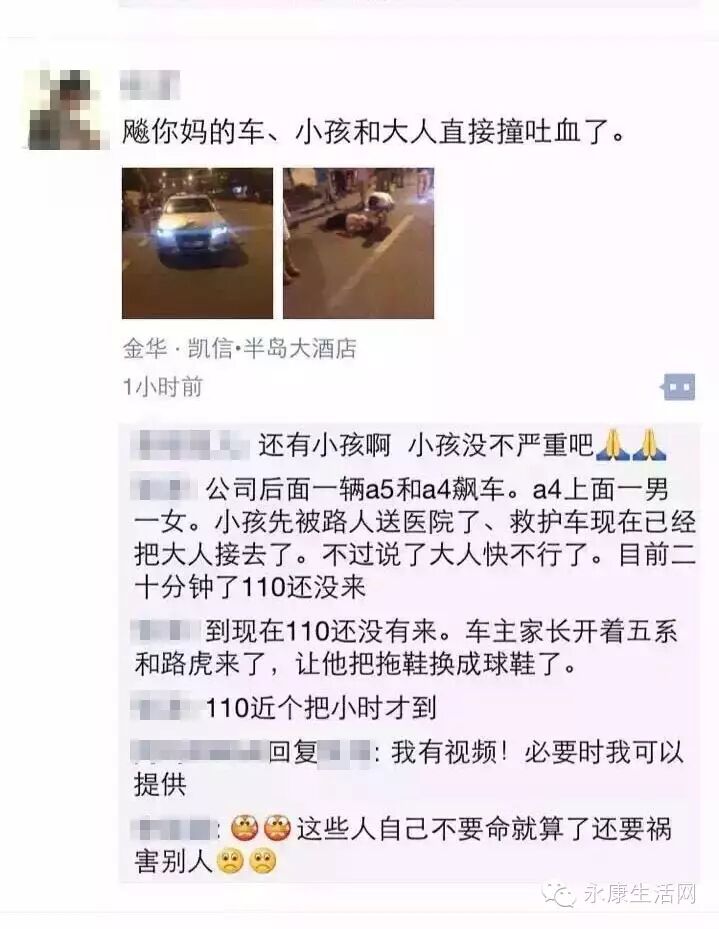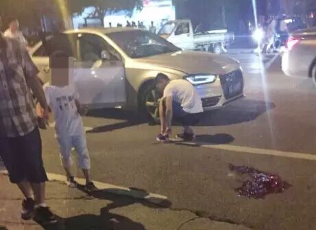 据目击者称,撞人的奥迪车上下来一男一女,男的穿着人字拖,一直在打电话,好像说让车主过来,之后来了辆大众车,大众车驾驶员把自己的运动鞋脱给奥迪驾驶员的,让他赶紧换下人字拖。
