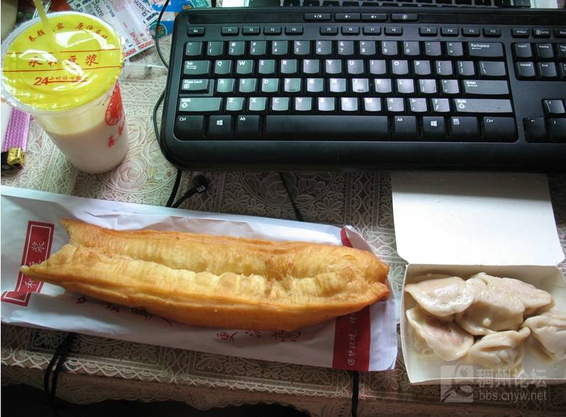 “今天早上锻炼完看到家门口新开一家永和豆浆,小时候对香港城那边那家记忆犹新,两块钱的油条跟狼牙棒一样大。于是进去,叫了一根油条一杯冰豆浆一笼小笼包打包。