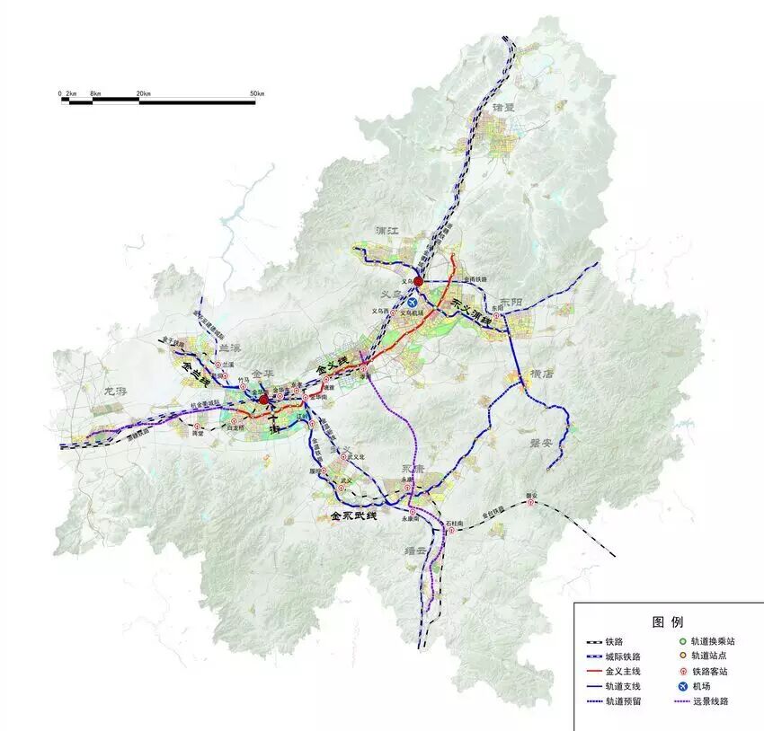 先开始建设金义线一期以及东义浦线一期,至2020年衔接两大区域枢纽,连接金华城区、义乌城区以及东阳城区。