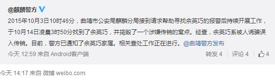 全文如下:2015年10月3日10时46分,曲靖市公安局麒麟分局接到请求帮助寻找余英巧的报警后持续开展工作,于10月14日凌晨3时50分找到了余英巧,并捣毁了一个涉嫌传销的窝点。经查,余英巧系被人诱骗误入传销。目前,警方已通知了余英巧家属。相关查处工作正在进行。
