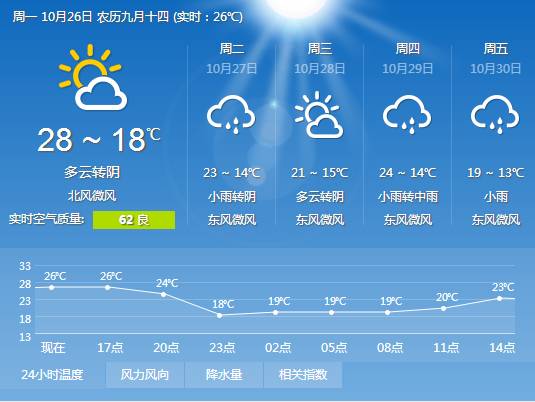 周四开始,第二拨冷空气就到了,小雨飘起来,气温会有更明显的下降。目前看来,本周五阴有有小雨,市区气温会跌到13-19℃;双休日那两天,市区最低气温只有10℃左右。