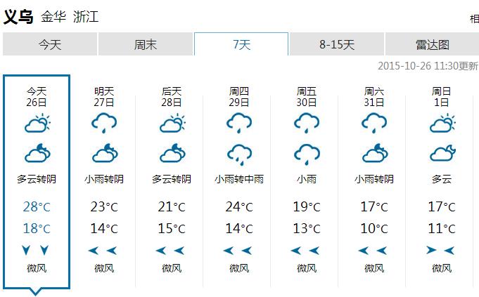来自义乌气象局预报,预计本周先晴后雨。27日前高空弱脊控制,多云为主;之后受高空槽偏北东移影响,阴雨天气增多,其中30日前后北方冷空气南下影响,预计有一次较明显的降水和降温天气过程。