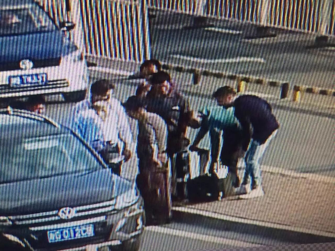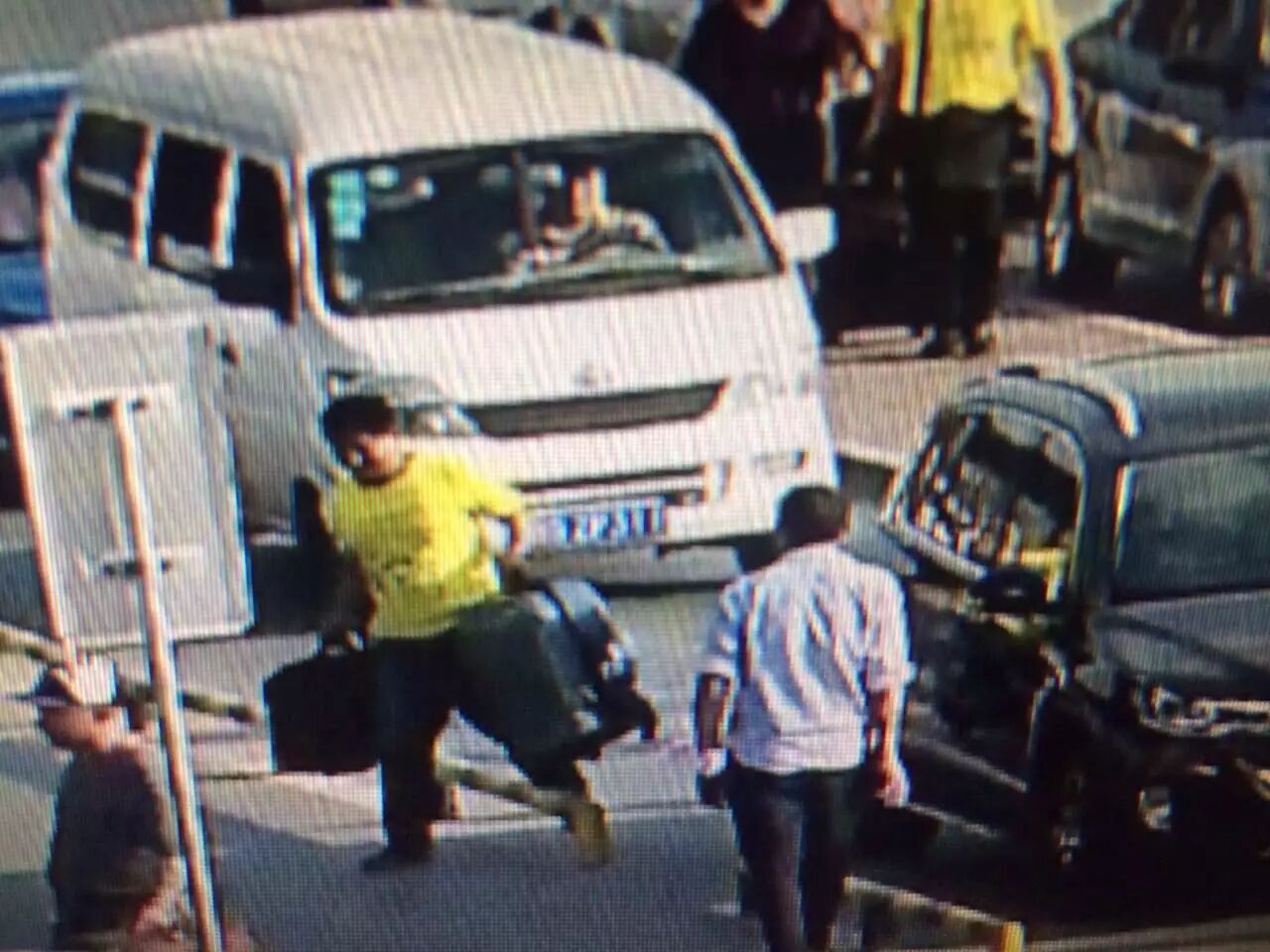 “10月21日下午5点36分的时候,有一辆小轿车过来, 她们车辆刚停下来,这个穿黄色衣服,姓蒋的江西籍人士,他直接上来开后备箱,这边一群人都围过来了,四五个人,就开始抢他们行李。白头发是他们的翻译,他们看到这个情况心里是比较慌的,就制止,叫他不要拿。但他们还是不听。穿绿衣服这个姓柯,是陕西三原人,他们就一直纠缠。这时候他们身边有四五个人务工人员在抢包。其中这个是外国人,他手上的包是一直不肯放的,穿绿衣服的一直在抢,他是被逼无奈了。还有这个也是外国人加上这个翻译显得很无奈。然后他们拎着包直接走了,老外一直在喊不要拿、不要拿。 ”
