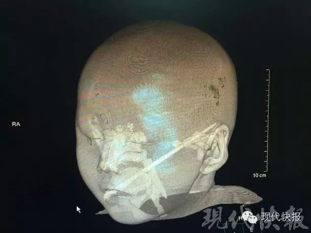 一路狂奔5小时辗转到南京,立即进入了绿色抢救通道。CT等检查的结果让医生都吃了一惊!筷子一共只有20厘米长。筷子前端的前段刺破了孩子的软腭,穿过颅底的颈静脉孔,扎进孩子的小脑,只差毫厘便可抵达后脑枕骨。插进大脑内的部分有3-4厘米。