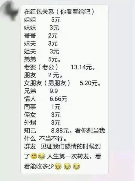 马上就要过年了,朋友圈的“微信乞丐”又要重出江湖了!自从有了微信红包功能,就产生了一种"微信乞丐",一天到晚,认识的要红包,不认识的也要红包。春天缺口罩,夏天缺饮料,秋天缺手套,冬天缺棉帽,八月十五缺月饼,平安夜来了又缺苹果,其实小编就想问问:你缺耳光不?!