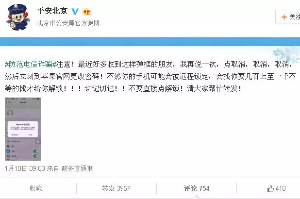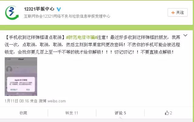 最近一些人的iPhone手机陆续在一夜间突然打不开了,屏幕上只留下一行字——“此Apple ID已锁定,请与QQ××××××联系(或是登录××网站)。”@公安部打四黑除四害官微曾发布通知:遇到这种情况,千万别点“解锁账户”