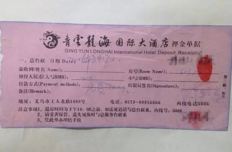 经当场盘问,该男子自称来义旅游,于3月17日凌晨2时左右入住该“公寓”,房费是100元一晚,还给他开具了一张抬头为“青云龙海国际大酒店”的押金单据。