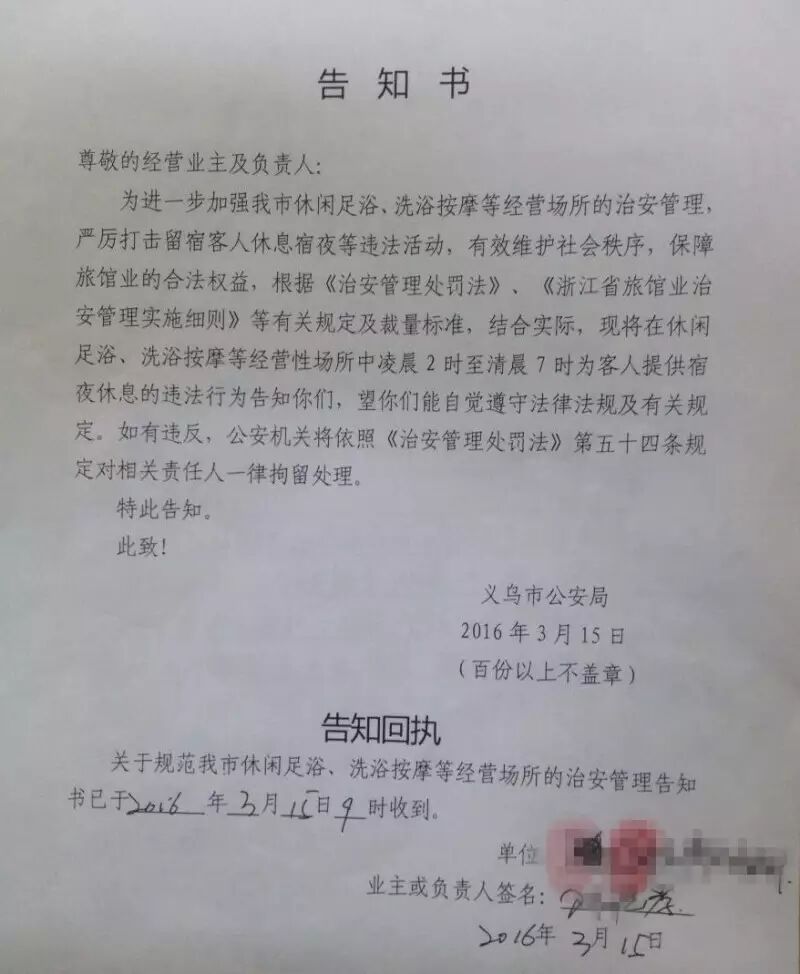 近期,义乌公安对休闲足浴、洗浴按摩等经营场所开展专项检查整治行动,严查凌晨2时至早上7时为客人提供宿夜休息服务的违法行为,凡是违反规定的,依据《治安管理处罚法》第54条规定对相关责任人一律拘留处理。