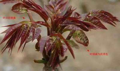 香椿叶根部是浅绿色,叶梢部是黄褐色;(上图)