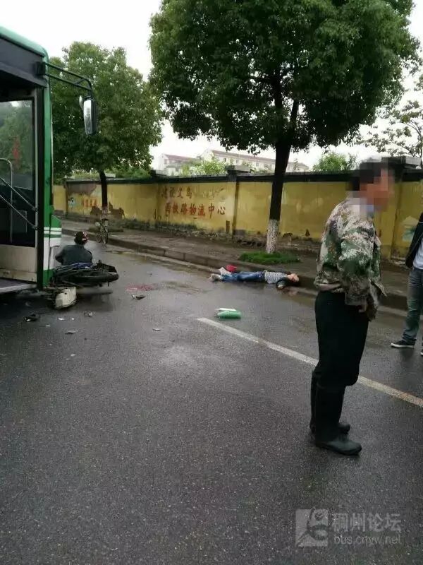下雨路滑,请大家驾驶自己的交通工具时千万慢行,5月21日早上义乌西站大道,一公交车与摩托车相撞了,摩托车主倒地一动不动,地上都是鲜血。