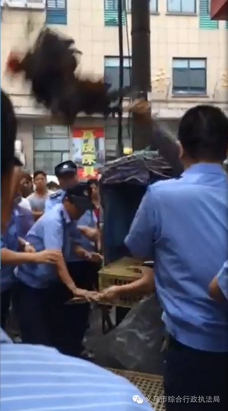 随后一男子赶到现场,同活禽经营者通过手掐、拉扯、踢踹执法队员、乱扔活禽等动作阻挠执法行为。