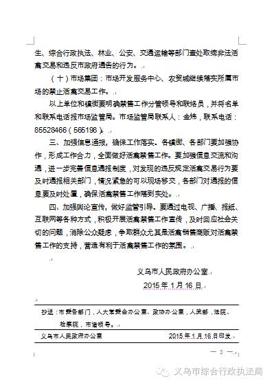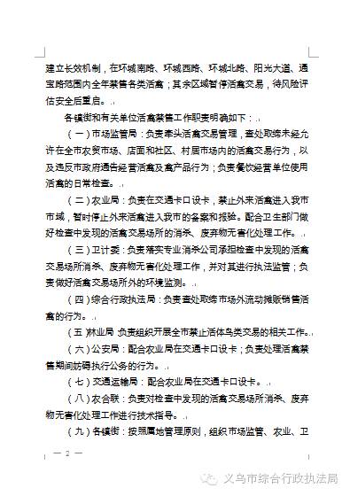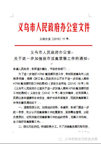 按照义政发(2015)11号文件要求,为做好H7N9禽流感防控工作,赤岸镇区域内暂停活禽交易,执法局负责查处取缔市场外流动商贩销售活禽的行为。