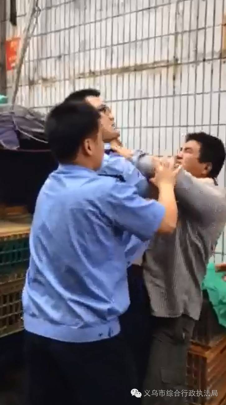 在这个过程中,执法队员被男子及经营者掐脖子、扯破衣服并被乱扔的活禽砸中面部,身上也被踢了数脚。执法队员极力保持克制,控制场面,避免事态恶化。